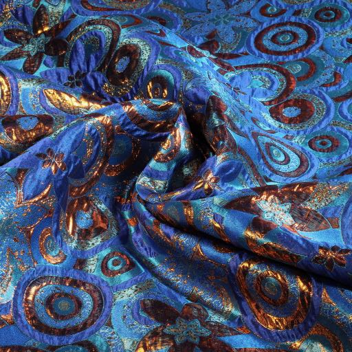 Jacquard is een stof met een ingeweven dessin welke aan beide kanten zichtbaar is. Deze stof is geschikt voor het maken van verschillende soorten kleding. Dit dessin is een hardloper voor carnaval en theater. De stof wijkt iets af van een gladde jacquard. Zoals u op de foto kunt zien hebben delen in de stof een kleine bubbel waardoor deze een nog wat rijkere uitstraling heeft. Dit design is bij Funkytex te verkrijgen in 3 verschillende kleurstellingen. Uitermate geschikt voor het maken van een kostuum. Kleuren in deze kleurstelling zijn onder andere Kobalt , blauw en brons